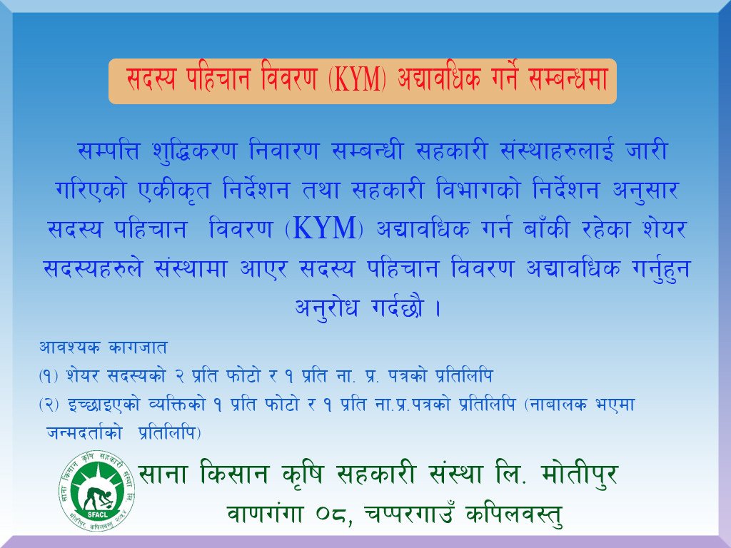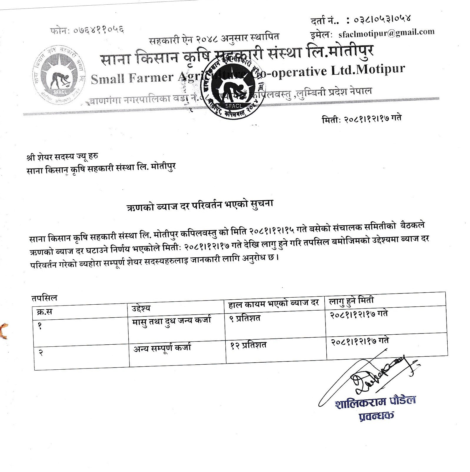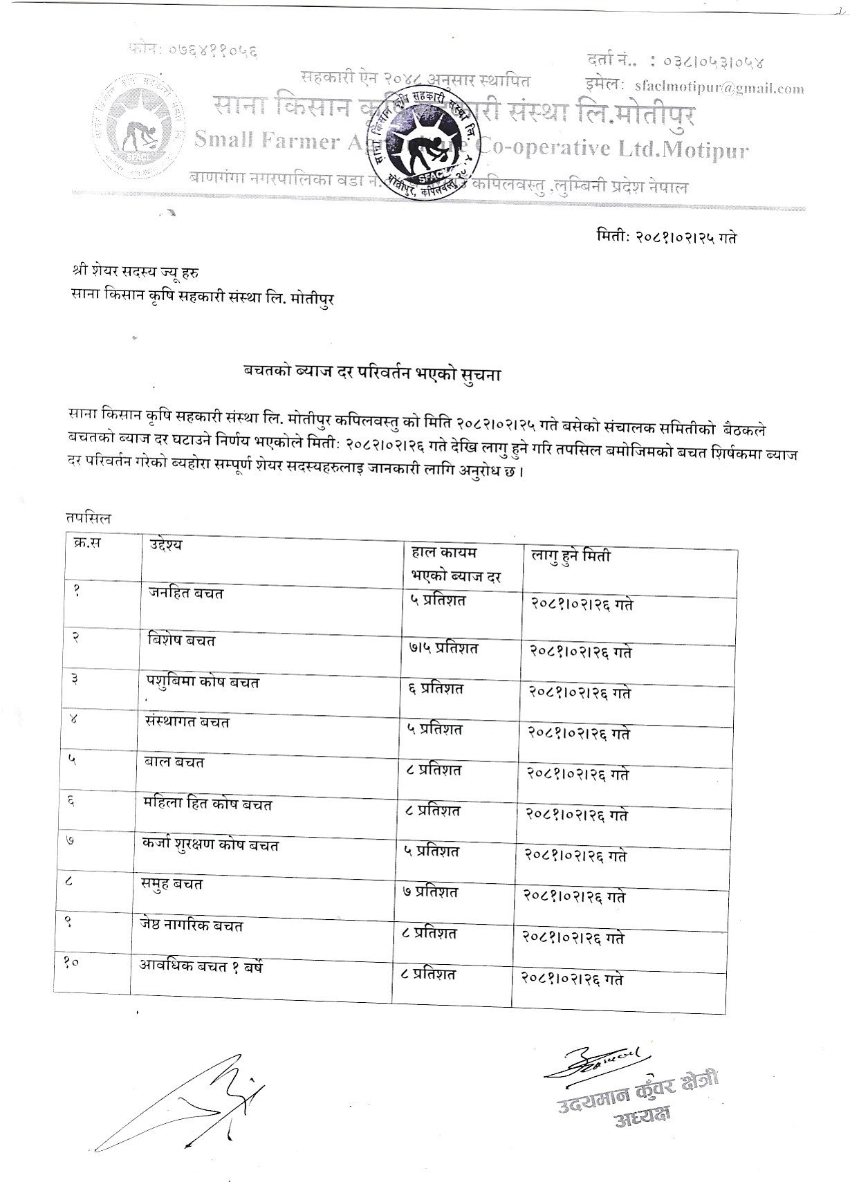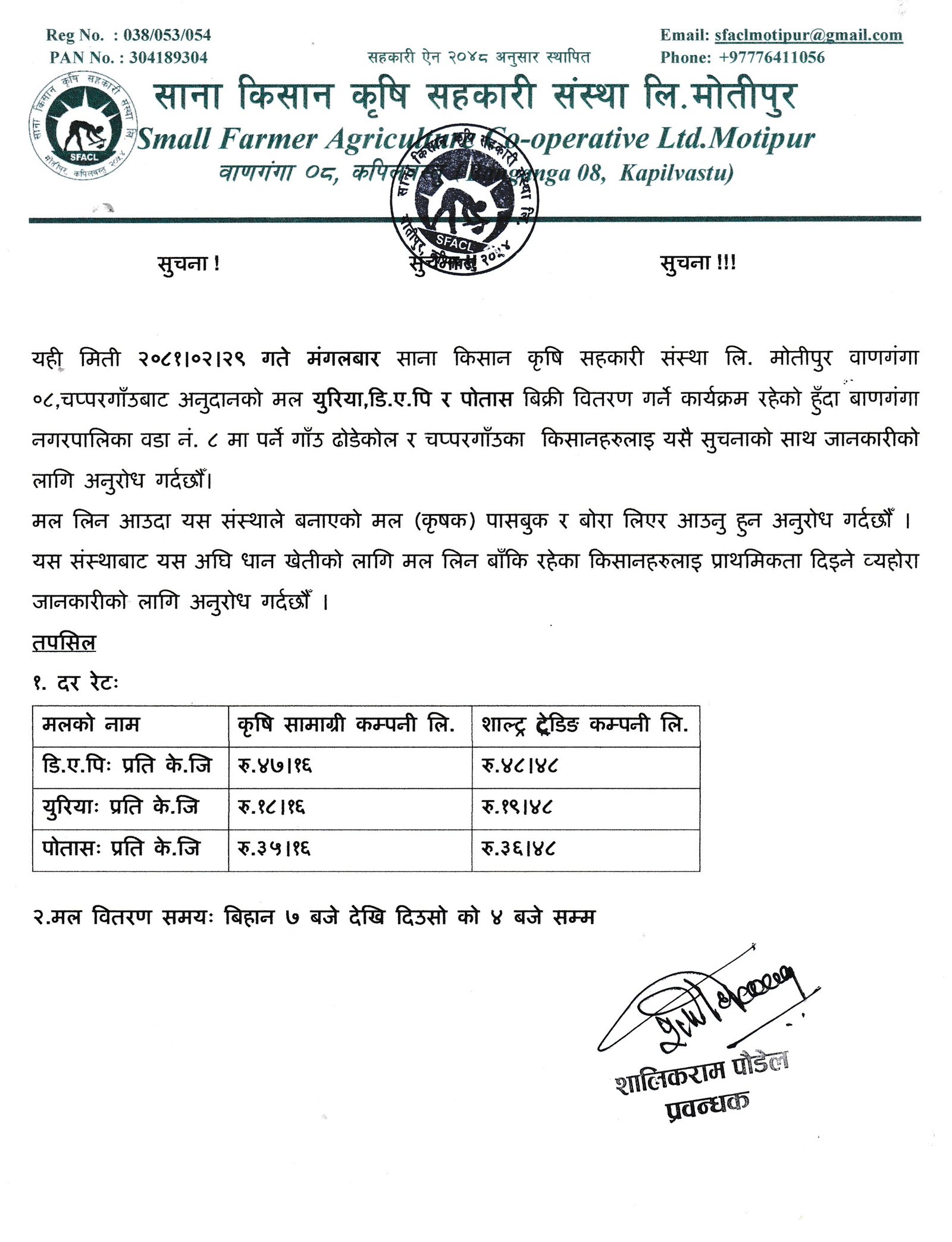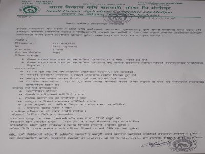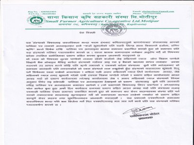 सहकारी एेन २०४८ अनुसार स्थापित २०५३।१०।२४ मा सहकारी डिभिजन कार्यालय ताैलिहवामा दर्ता भएकाे सबैको विस्वासिलो संस्था साना किसान कृषि सहकारी संस्था लिमिटेड मोतिपुर वाणगंगा ०८ चप्परगाँउ कपिलवस्तु Small Farmer Agriculture Co-operative Ltd. Motipur